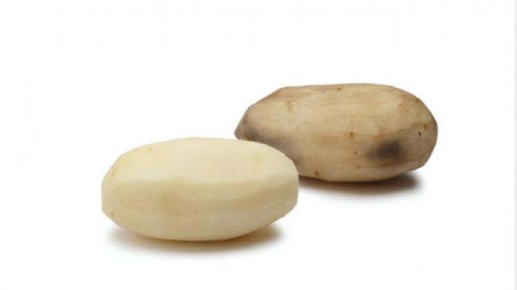 When peeled and left out in the air, Innate potatoes, shown on the left, take longer to brown. On the right is a conventional russet Burbank potato.
