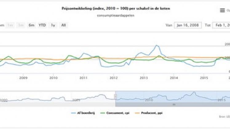 De af-boerderij aardappelprijzen liggen dit aardappelseizoen (2015-2016) op bijna 97 punten, ruim 40 punten hoger dan het voorgaande seizoen (2010=100). Het hogere prijsniveau is bepaald door meerdere factoren. Volgens de oogstramingen is de aardappelproductie in Nederland en Noordwest-Europa dit seizoen kleiner ten opzichte van voorgaande jaren. De aardappelverwerkende industrie draait op volle toeren om aan de buitenlandse vraag naar aardappelproducten te kunnen voldoen. Partijen die tijdens of kort na de oogst kwalitatief minder waren (onder andere rot) zijn tijdig verwerkt. De export van verse aardappelen is lager met uitzondering van de export naar België. Halverwege het seizoen blijken de aardappelvoorraden krapper dan verwacht. De producentenprijsindex (PPI) is opgelopen tot 118 punten. De verwerkers kopen via contracten in, waardoor ze relatief stabiele verkoopprijzen hanteren. De consumentenprijsindex ligt in februari bijna 30 punten hoger dan een jaar eerder, maar nog beneden 110 punten. De consumentenprijs volgt de prijsontwikkeling in de aardappelmarkt, maar de relatieve uitslagen zijn kleiner dan bij de af-boerderijprijzen. Dit komt omdat in die consumentenprijs ook kosten zijn opgenomen voor onder meer sortering, verpakking en transport.