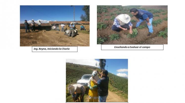Previa la coordinación con los productores el personal de la agencia agraria representado por el Ing. Nelson Reyna y por la Empresa BASF el Ing. David Jáuregui asistieron en fecha 27 de febrero del presente a dichos caseríos para dar inicio a la escuela de campo que es una técnica de enseñanza para adultos aprender –haciendo. Las actividades que se desarrollaran desde la siembra hasta la cosecha del tubérculo serán el manejo de cultivo, evaluación de plagas y enfermedades como su control, cosecha, almacenamiento, post cosecha y comercialización del papa tubérculo.En esta sesión se les enseño a los productores las técnicas de aplicación de pesticidas, uso responsable de agroquímicos y evaluación de plagas y enfermedades en campo, como medida de educación en temas de las Buenas Prácticas Agrícolas.De otro lado a los productores se le enseño a identificar las principales enfermedades encontradas como son rancha y alternaría y como plagas insectiles al Gorgojo de los Andes.